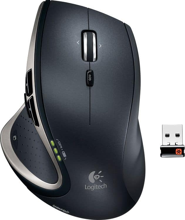 ガラス面でトラッキングできるセンサー、親指スイッチ、長寿命バッテリーで、高価な製品だがボタンの配置等が快適なマウス。